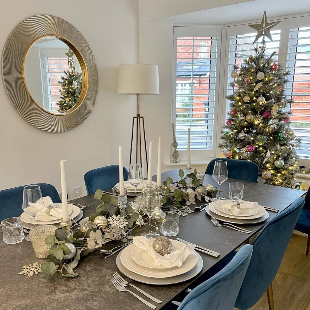 The dining table is the heart of festive gatherings. Place a runner or garland down the centre, layered with fairy lights, greenery, and candles of varying heights. Keep the food on a side table to let your decor shine, add crackers or mini gifts at each place setting for a charming touch.