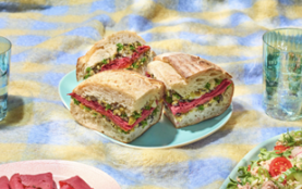 This muffuletta is a Sicilian-American style sandwich that originated in New Orleans, Louisiana. It delivers bold flavours, distinct layers and is made with bold, smoky Pastrami Style Slices and a spicy tangy olive salad — all packed into a large focaccia.