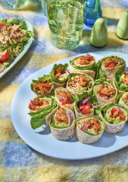 4. Roll up the tortilla tightly, starting with the guacamole end and finishing with the lettuce end. Wrap in tinfoil to hold together and keep closed. Repeat with the remaining tortilla. Slice each tortilla into 6-8 rounds when ready to serve.