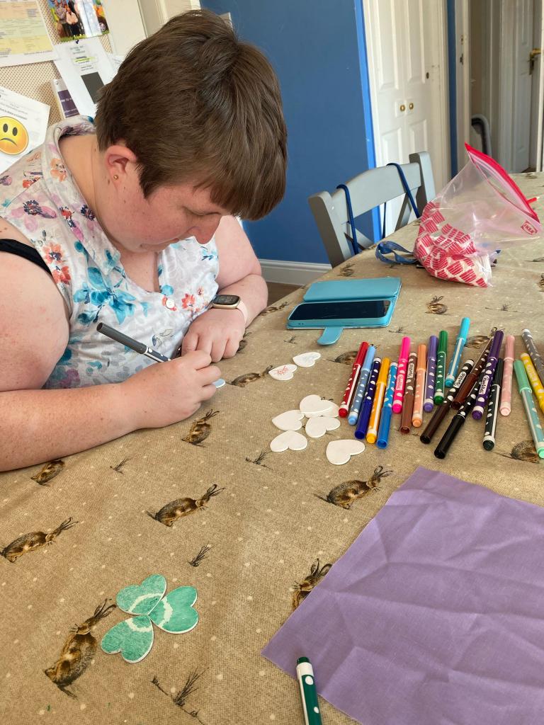 “We have created a large fabric wall hanging that is made from a patchwork of about 70 pieces of material, each decorated by the people we support. This medium gave everyone the opportunity to participate as it could be adapted to suit people’s sensory and physical needs. Everyone worked in teams to create the art for their piece of art.”