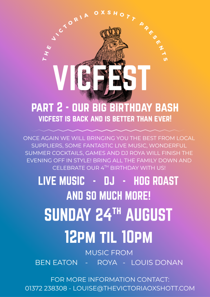 Celebrate the fourth anniversary of the Victoria Oxshott with Vicfest, the Big Birthday Bash on Sunday, 24th August.