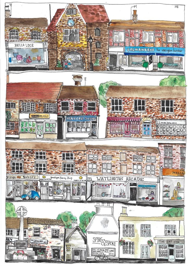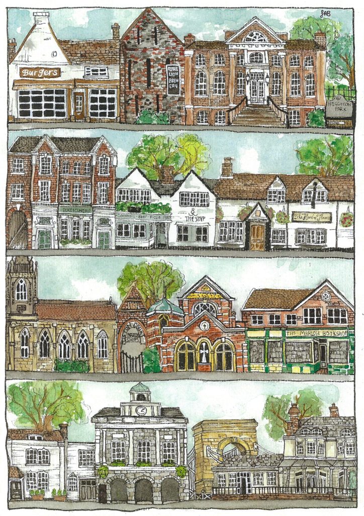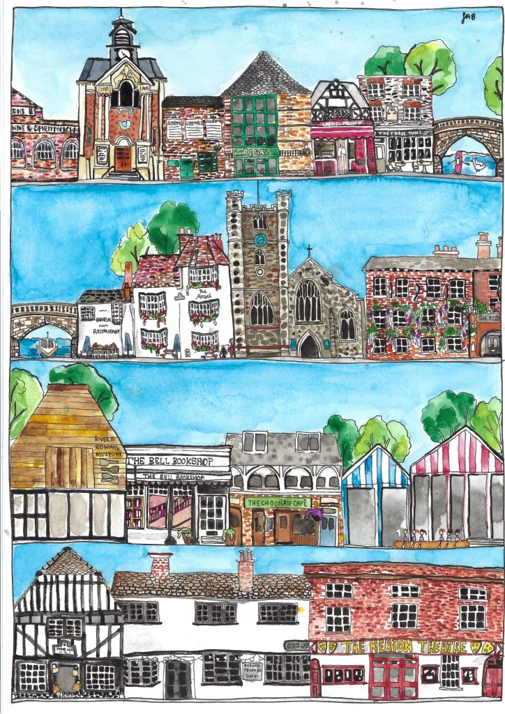 From mid-August to October, my artwork will be on display at Watlington Library. I especially enjoy mixing text from books with illustrations of historically important places. I’m always open to requests and love creating something meaningful for others. Living in Watlington with my family, two cheeky dogs (Jonty and Fig), and a lawn-munching pony keeps me grounded and inspired. Oxford, Henley, and Marlow continue to feed my creativity.
